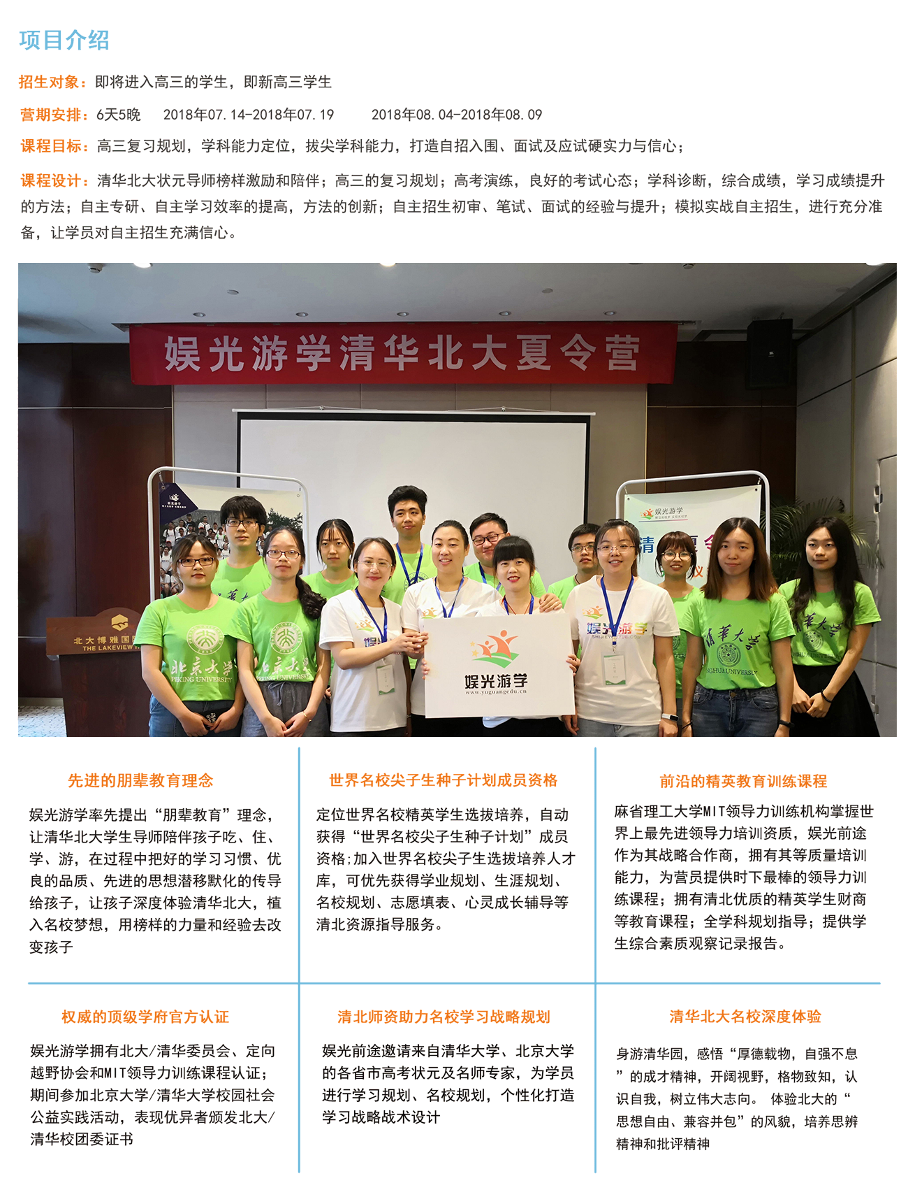 教学优势: 清华北大名校深度体验+世界名校尖子生种子计划成员资格+清北师资助力名校学习战略规划+最先进的朋辈教育理念。