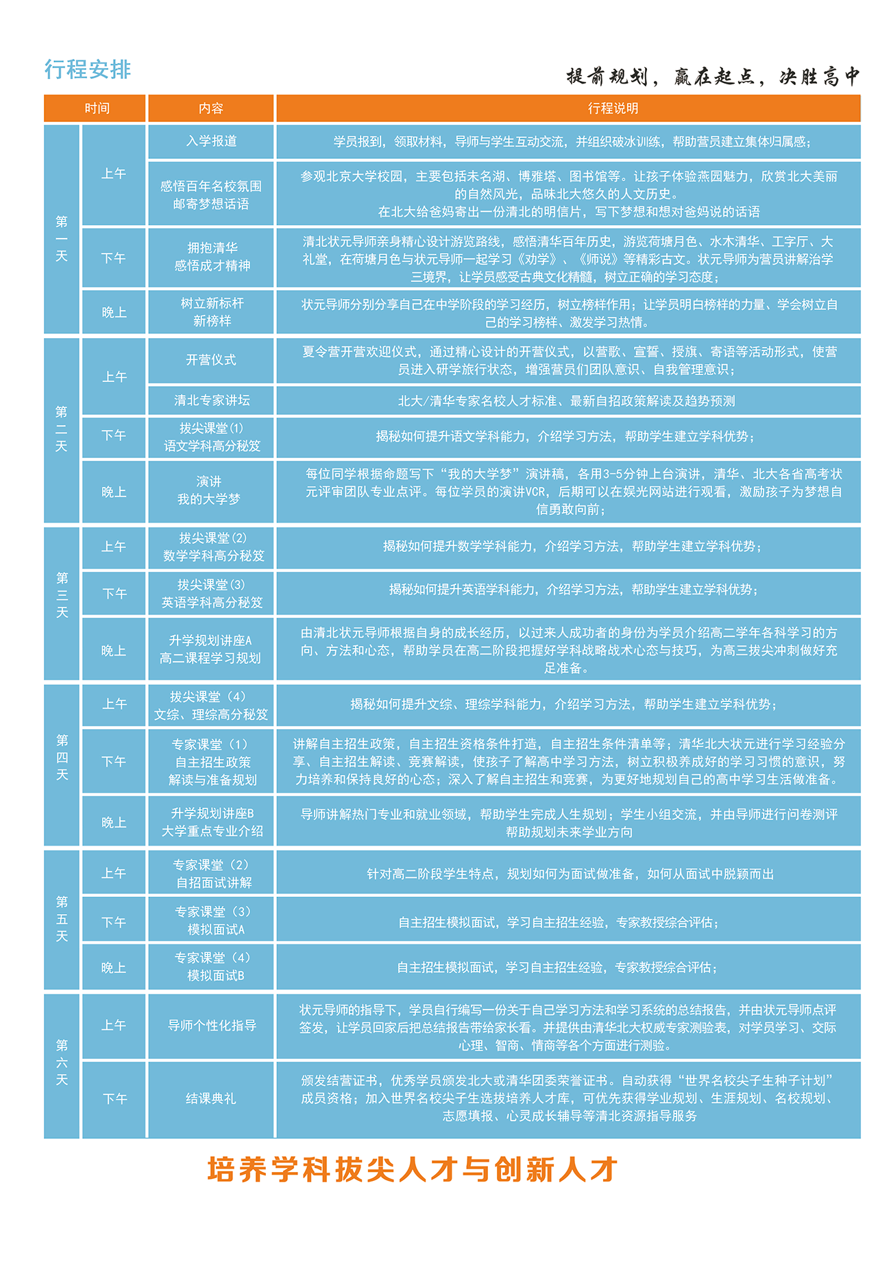 营期:6天5夜    适合人群:即将进入高二的学生,即新高二学生