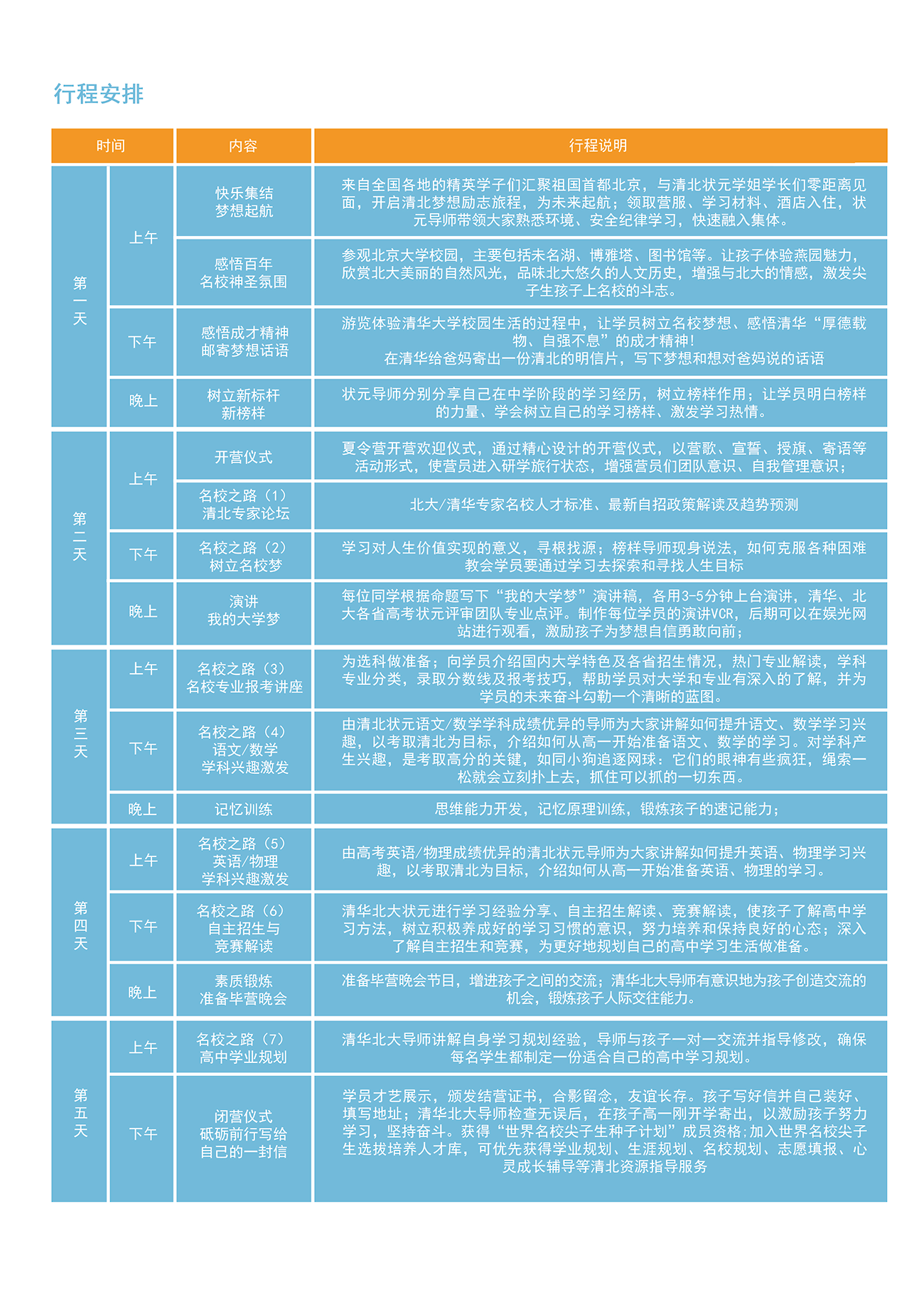 营期:5天4夜    适合人群:即将进入高一的初三毕业生,即新高一学生